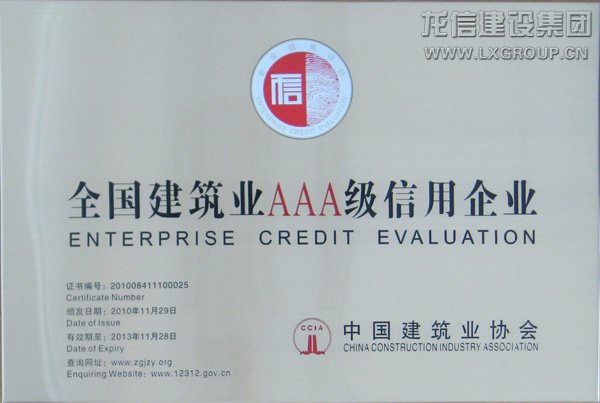 2011年1月17 日,全國(guó)建筑業(yè)第二批AAA信用企業(yè)發(fā)布會(huì),在北京科技會(huì)堂隆重舉行,建設(shè)部市場(chǎng)司、質(zhì)量司、商務(wù)部、國(guó)資委、建筑業(yè)協(xié)會(huì)相關(guān)領(lǐng)導(dǎo)出席發(fā)布會(huì)。集團(tuán)公司憑借多年來(lái)誠(chéng)實(shí)守信的經(jīng)營(yíng),獲得這一榮譽(yù)。建筑業(yè)協(xié)會(huì)秘書(shū)長(zhǎng)吳濤向公司授牌。