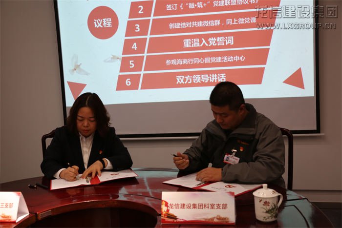 本次活動以“融·筑+”黨建結對共建為主題,全體黨員共同重溫入黨誓詞,堅定理想信念。龍信集團科室支部副書記施金浩與海門農商行機關第三黨支部書記劉曉艷共同簽訂《“融·筑+”黨建聯盟協議書》,以“黨建互促、服務互聯、專業互助、資源互享、廉政互督”為原則建立聯系、加強溝通,實現信息共享、優勢互補。現場黨員們共同創建“融·筑+”黨建結對共建微信群,同上“微黨課”《讓信仰之光在心中閃亮》。隨后大家重溫入黨誓詞并參觀海門農商銀行同心圓黨建活動中心。