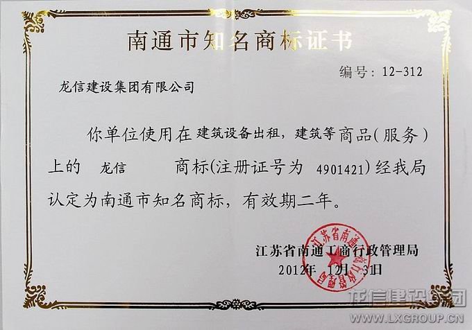 此外,在每一個龍信人的努力下,基于業界的口碑、市場的認可、大眾的肯定,龍信集團一直享有較高的聲譽,“龍信”商標經江蘇省南通市工商行政管理局認定為南通市知名商標。