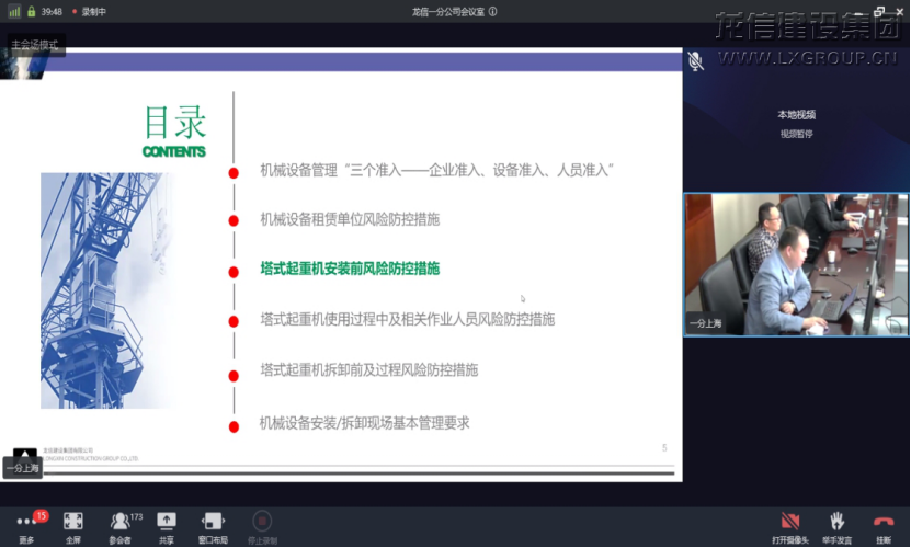 此次培訓會由一分公司工程部姜洪標總監主持,楊勇和王士廣兩人分別進行主講培訓,內容涵蓋:機械設備管理“三個準入”企業準入、設備準入、人員準入,機械設備租賃單位風險防控措施,機械設備安裝前風險防控措施,機械設備使用過程中及相關作業人員風險防控措施,機械設備拆卸前及過程風險防控措施,機械設備安裝/拆卸現場基本管理要求,關于大型機械設備安裝/拆卸專項施工方案編制基本要求,危大工程范圍,危大工程管理,專項施工方案管理,過程監督,現場方案管理舉例。