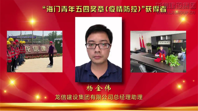 在五四青年節到來之際,共青團海門市委、海門市青年聯合會特向優秀青年和集體頒發“海門青年五四獎章”。龍信建設集團有限公司青年志愿服務隊榮獲“海門青年五四獎章集體”,龍信建設集團有限公司總經理助理楊金偉榮獲“海門青年五四獎章”(疫情防控)。4月30日,由海門市新時代文明實踐中心辦公室、共青團海門市委主辦,海門市融媒體中心承辦,龍信集團等單位共同贊助的“不懼風雨,奮勇前進”——海門市“五四”青年節線上文明實踐暨道德講堂總堂示范觀摩活動通過電視和網絡進行同步直播,活動現場進行表彰。