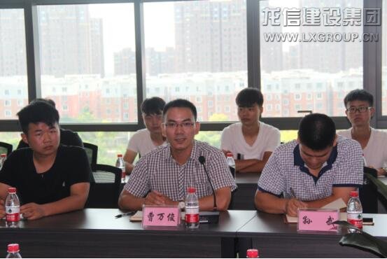 7月3日上午,在龍信大廈五樓會議室召開專家座談。龍信集團工會主席卞勤華、副總經理何咸軍、施工技術部經理張豪、人力資源部副經理宋斌斌、顧問黃麗英等出席會議。集團副總經理何咸軍向學員們簡要介紹了龍信集團近年來的發展情況,對學員們的實習提出了明確要求。