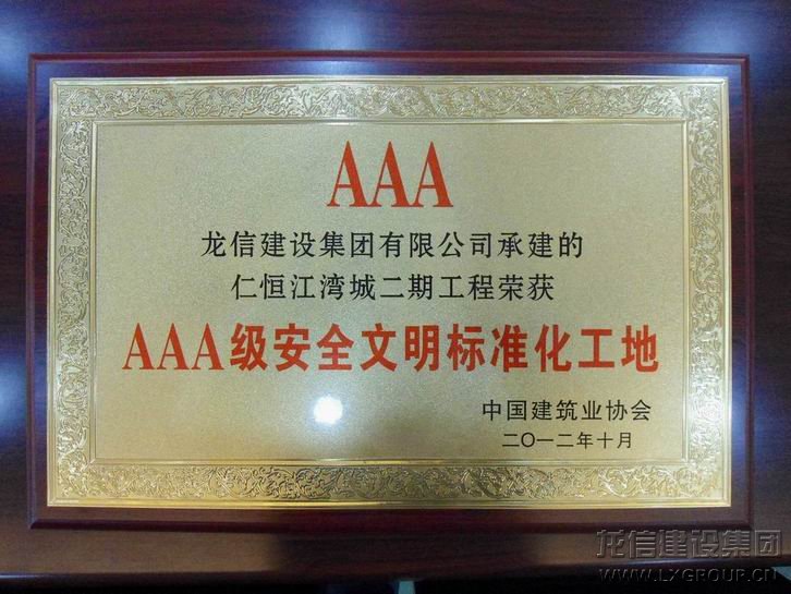 龍信建設(shè)集團(tuán)有限公司承建的仁恒江灣城二期項(xiàng)目部建設(shè)過(guò)程中經(jīng)過(guò)國(guó)家、省市建筑主管部門(mén)領(lǐng)導(dǎo)逐級(jí)對(duì)施工文明管理資料審查、現(xiàn)場(chǎng)嚴(yán)格考核,終獲2012年度國(guó)家級(jí)“AAA級(jí)安全文明標(biāo)準(zhǔn)化誠(chéng)信工地”。